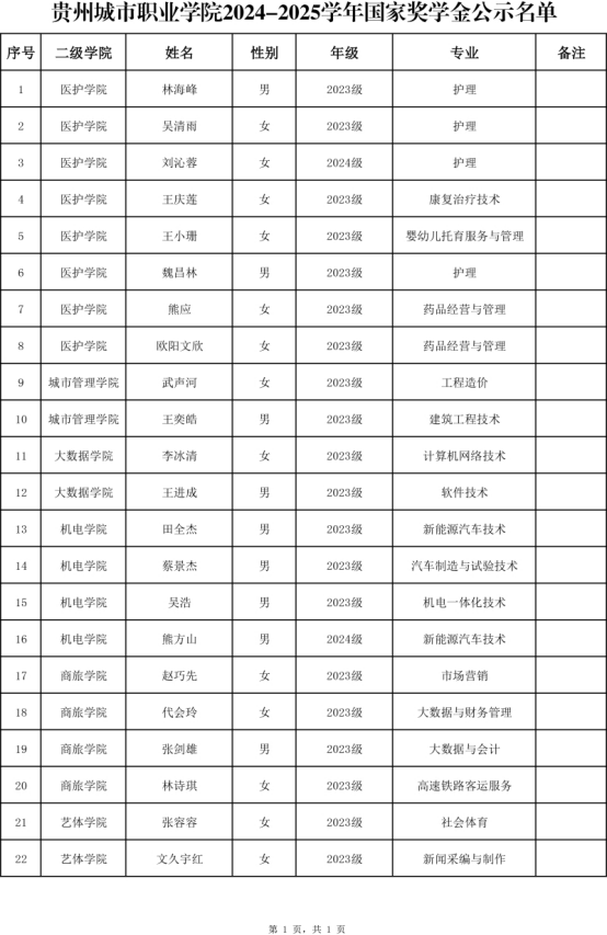 贵州城市职业学院2024-2025学年国家奖学金评选结果公示
