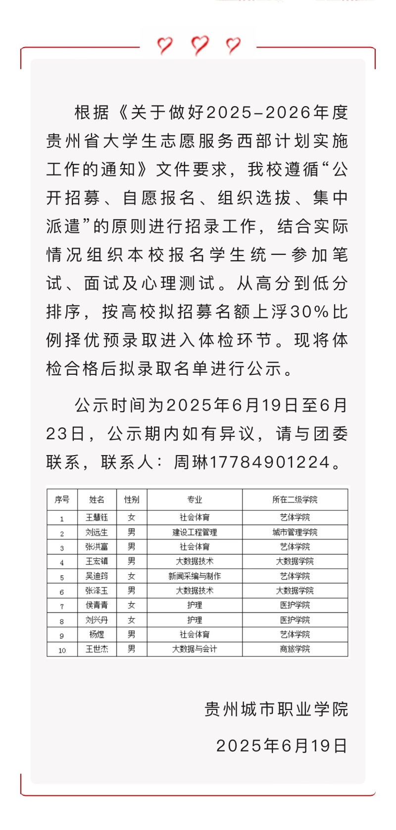 贵州城市职业学院2025-2026年度贵州省大学生志愿服务西部计划拟录取名单公示