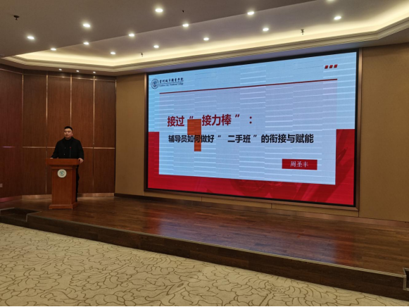 艺体学院周圣丰老师以《接过“接力棒”:辅导员如何做好“二手班”的衔接与赋能》为主题,分享如何管理好“二手班”的心得体会。他围绕良好的心态、更多的付出、更加完善的工作流程制度等三个方面,以案例分享的形式详细解析了在“二手班级”管理中的困难和解决办法,为辅导员提供了宝贵的借鉴经验。