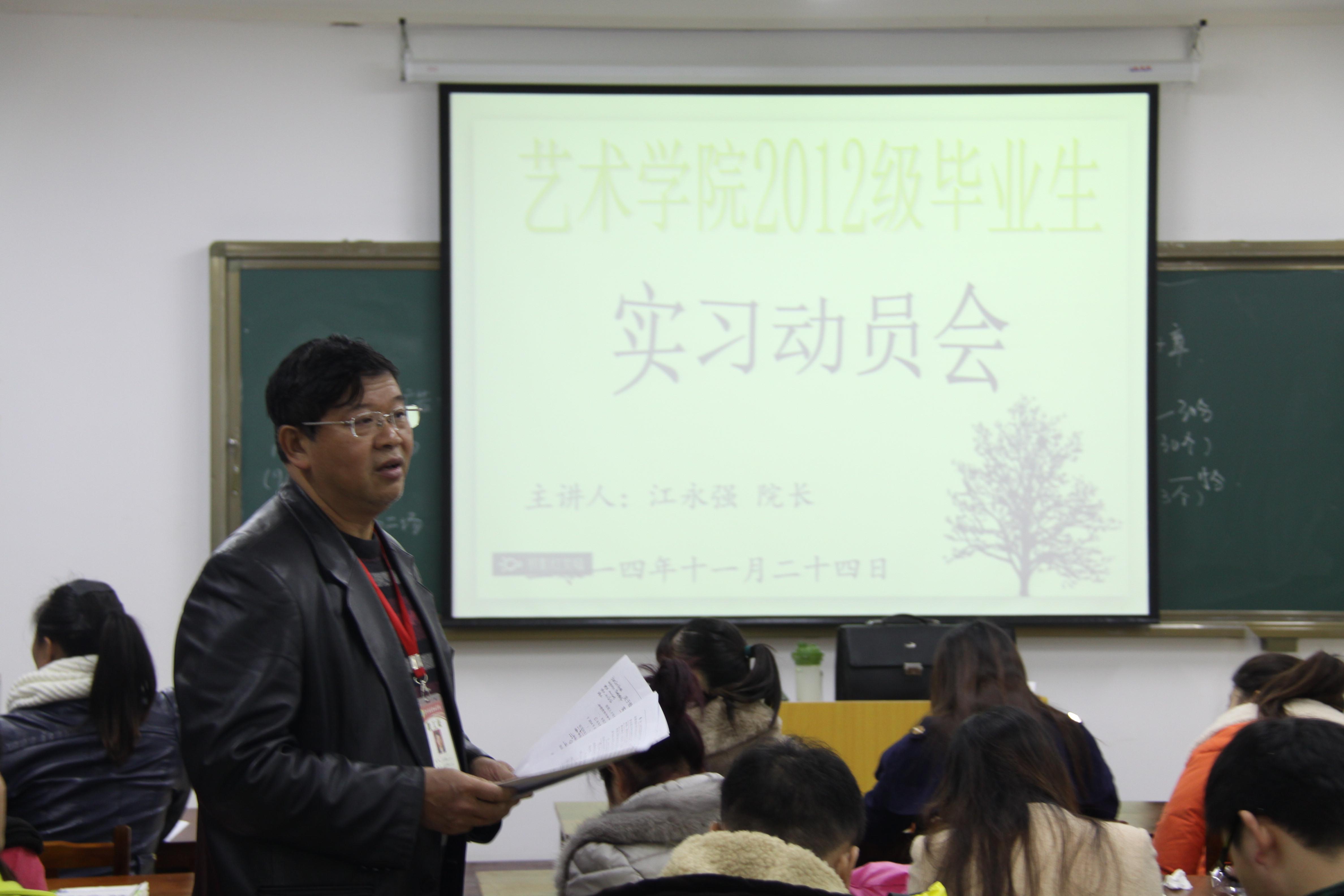 2014年11月24日中午,贵州城市职业学院艺术学院在315多媒体教室召开了2012级毕业生实习动员大会。艺术学院院长江永强进行了实习意义的宣讲。