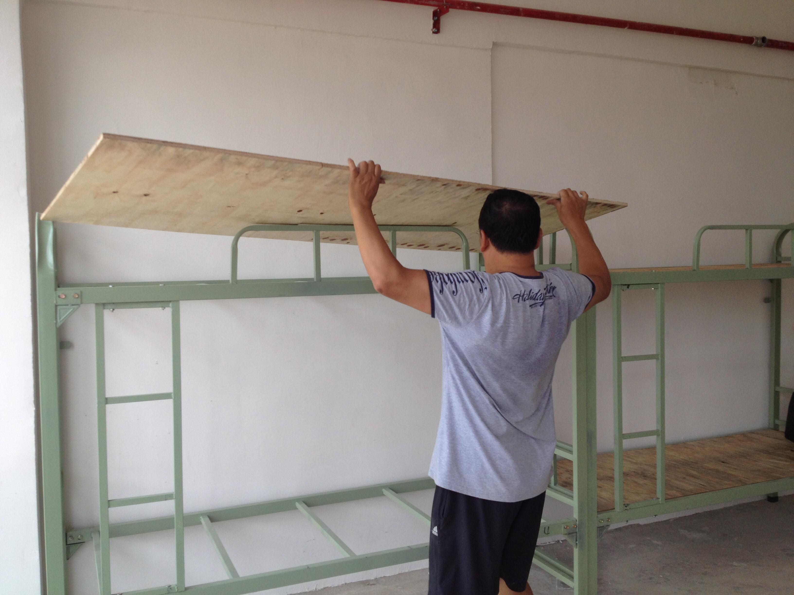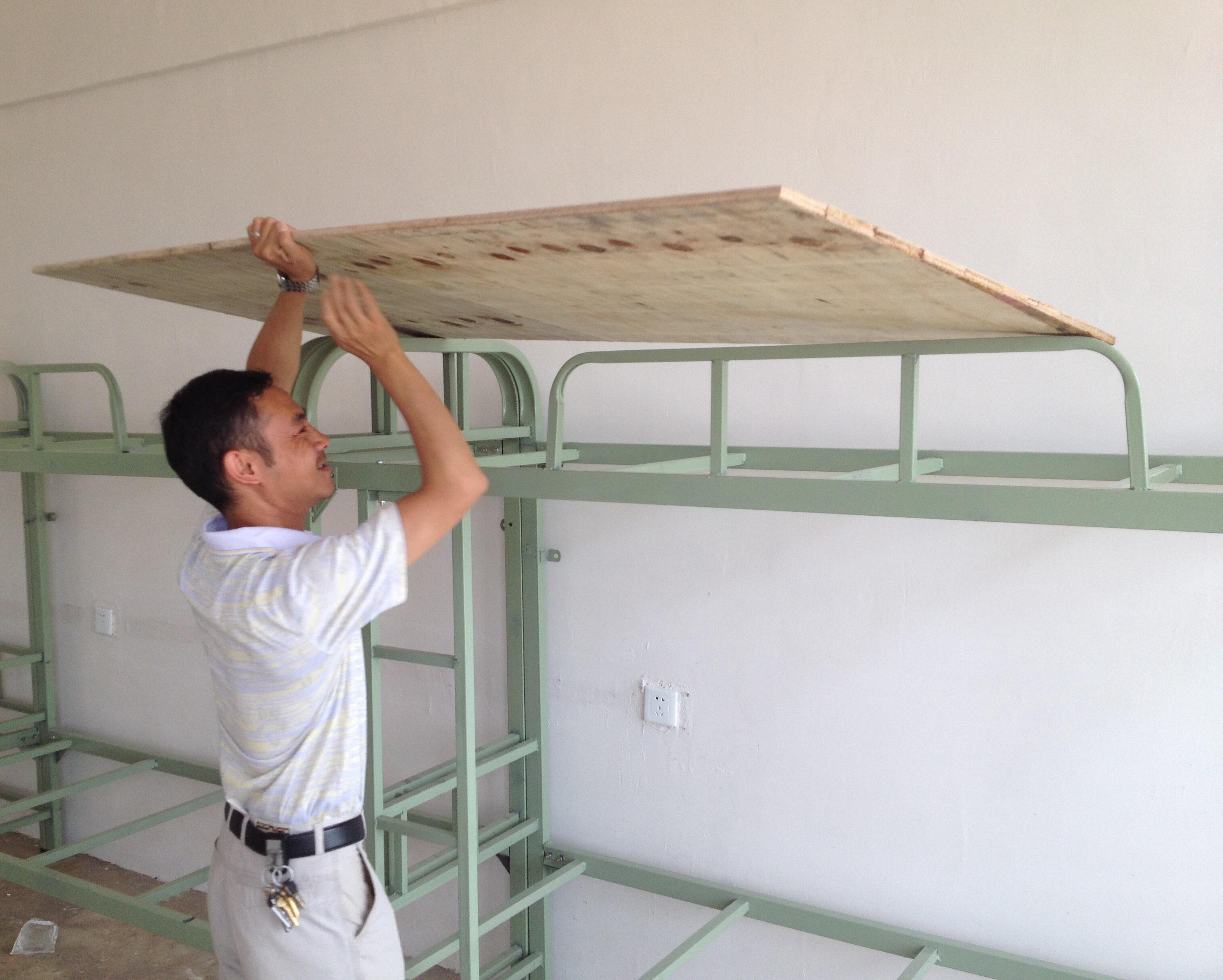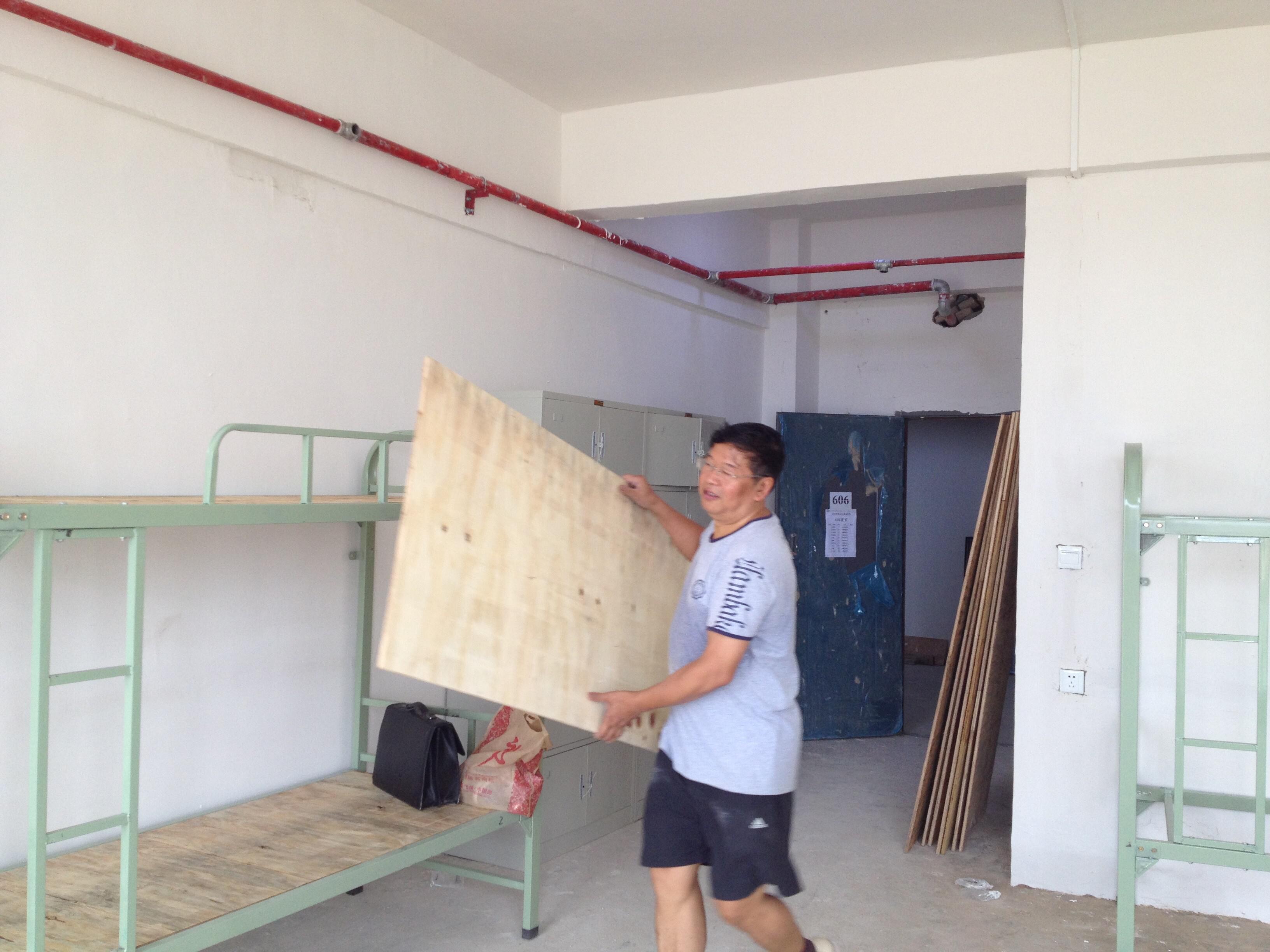 图为 文绍军老师为学生寝室安置床板