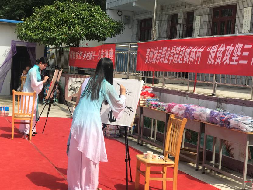 艺术学院的老师同学们精神饱满,意气风发,以满腔的热情、表演了配乐诗朗诵《我的中国梦》、舞蹈《溜溜的康定溜溜的情》、现场作画《画梅》、歌曲《我在贵州等你》、舞蹈《花儿为什么这样红》等精彩节目。村民们—个个侧耳静听,凝神观看,满脸会心满意的微笑。